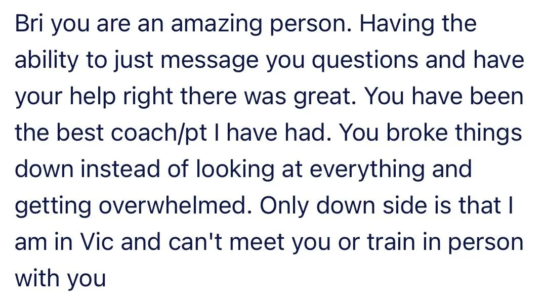 Premium 1:1 Coaching is for you if you want to completely level up with your training and your nutrition! We don’t do surface level stuff around here, we are here to dig deep to the root problem, so that you can actually make changes that will last. This is suitable from beginners who are completely new to both nutrition and training, all the way to advanced trainers and food trackers, who are wanting that extra push or are maybe heading into a fitness competition (like Hyrox, marathon etc).